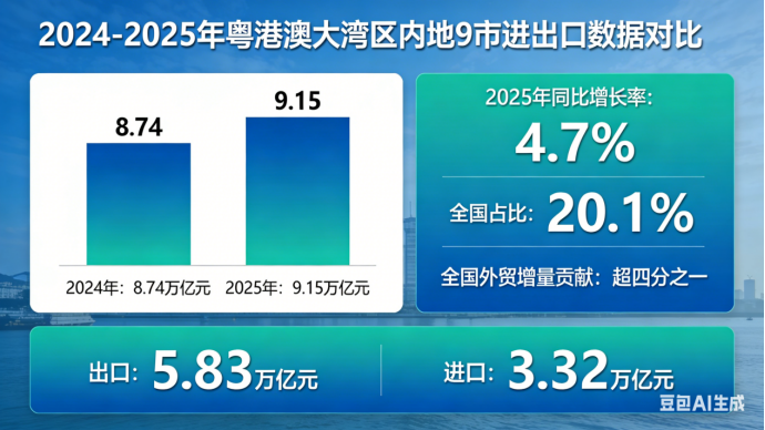 研讨会上公布的一组亮眼数据,彰显了大湾区作为中国外贸“压舱石”的雄厚实力:2025年,粤港澳大湾区内地9市进出口规模历史性地站上9万亿元新台阶,达9.15万亿元,同比增长4.7%,占全国进出口总值的20.1%,为全国外贸增长贡献了超过四分之一的增量。数据背后,是产业结构的持续优化与升级: