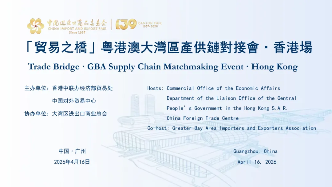 4月16日下午,第139届广交会重磅配套活动 ——“贸易之桥・粤港澳大湾区产供链对接会香港专场”在广州成功举办。本次活动以“广交天下・智造共赢”为主题,由中央政府驻港联络办经济部贸易处、中国对外贸易中心联合主办,大湾区进出口商业总会协办,25家香港采购商、70余家广交会参展商齐聚一堂,以精准高效的产供链对接,推动“湾区智造 + 香港服务”深度融合,为粤港澳大湾区经贸协同发展注入强劲动能。